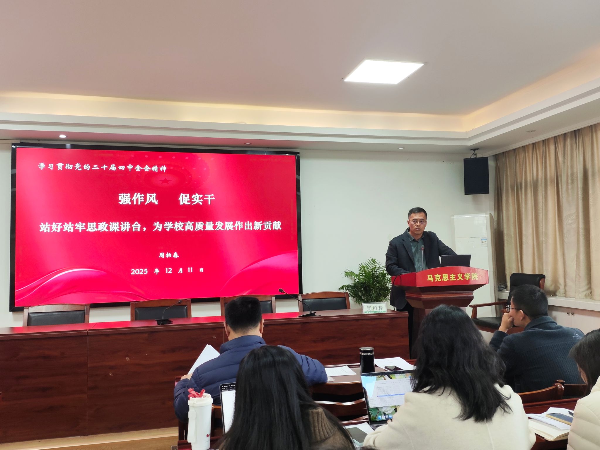 周柏春作《强作风促实干,站好站牢思政课讲台,为学校高质量发展作出新贡献》专题宣讲。他聚焦思政课教学实际,提出教师应常怀“三心”:一要深怀敬畏之心,以高度的政治责任感和严谨态度投身教学;二要深怀谦逊之心,涵养师德,以人格魅力引导学生;三要深怀笃行之心,推动教学改革,提升教学能力,将全会精神有机融入课堂,切实增强思政课的思想性、理论性和感染力。